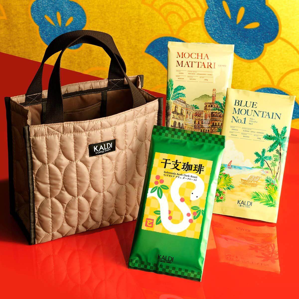 | 内容 | ・ニューイヤーブレンド2025(6個) ・干支珈琲 インドネシア アチェ ダークロースト(6個) ・ブルーマウンテンブレンド(6個) ・パナマ ゲイシャ(4個) ・有機 バードフレンドリー® ダークロースト(6個) ・バッグ ⇒ サイズ(約)縦38×横40cm 持ち手27cm 肩掛け51cm |