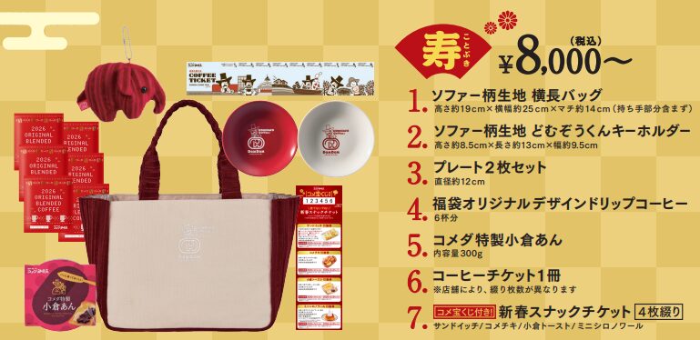 | 内容 | ・ソファー柄生地 横長バッグ ・ソファー柄生地 どむぞうくんキーホルダー ・プレート2枚セット ・福袋オリジナルデザインドリップコーヒー(6杯分) ・コメダ特製小倉あん ・コーヒーチケット1冊 ・コメ宝くじ付き 新春スナックチケット(4枚綴り) |