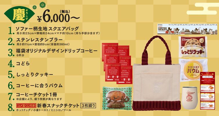 | 内容 | ・ソファー柄生地 スクエアバッグ ・ステンレスタンブラー ・福袋オリジナルデザインドリップコーヒー(6杯分) ・コどら ・しっとりクッキー ・コーヒーに合うバウム ・コーヒーチケット 1冊 ・コメ宝くじ付き 新春スナックチケット(3枚綴り) |